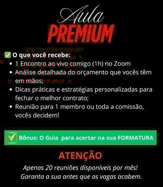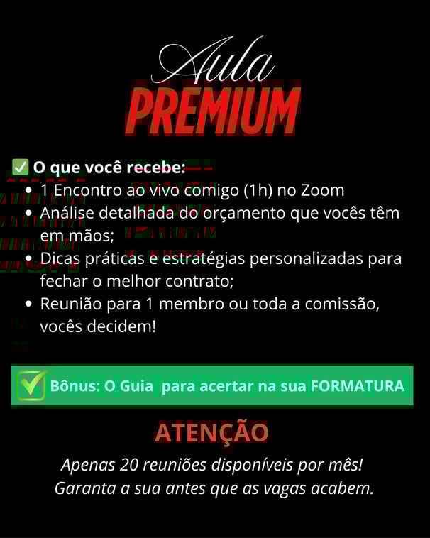 Oi, gente! Sou o Lucas, presidente da minha comissão de formatura. A gente fez uma call com a Dauany na aula premium e ela entendeu tudo o que estávamos passando. Nos ajudou a resolver todos os problemas! Não participamos do guia, mas recebemos ele como bônus antes da reunião e fez toda a diferença. Obrigado, Dauany, você foi essencial pra nossa turma!