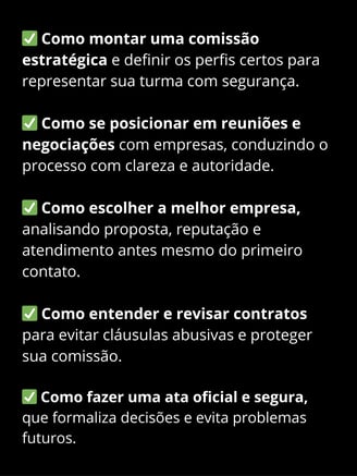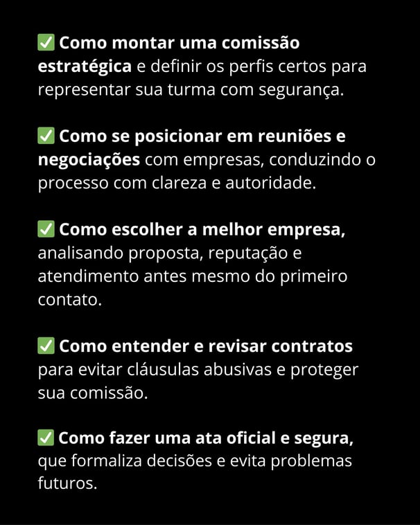 Aprenda a se posicionar com segurança antes de fechar o contrato da sua formatura. Domine todos os assuntos que ninguém te ensina: reuniões, atas, contratos, grupos e estratégias para escolher a melhor empresa. Esteja preparado para decidir com clareza e confiança.